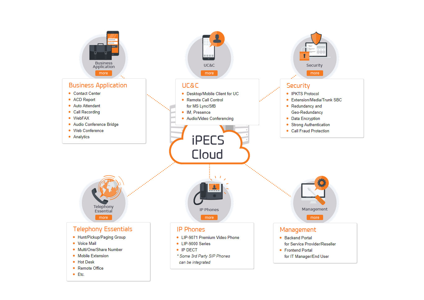 iPECS Cloud is a Best-In-Class UCaaS solution accommodated to the cloud environment. iPECS Cloud contains Agility, Flexibility and Simplicity on top of the proven technology of Ericsson-LG Enterprise, leading in business communications. Equipped with a variety of end-points, applications and features, iPECS Cloud could be your smart option for your communication system.